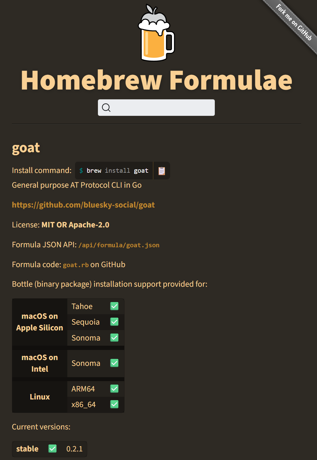 Goat, for the record, is named "Go AT", because it's a Go tool for working with the AT protocol — great stuff, self-explanatory, somehow that wasn't already taken by another popular CLI tool. As I've mentioned, I really like Go for building straightforward, maintainable tools — it's a nicely inflexible language, and it's super portable, very easy to build and release Go apps for Windows/Mac/Linux. This makes it a great fit for Homebrew! Although Homebrew started out as a Mac package manager (and it thankfully handles Mac binary signing for you), many maintainers publish Linux source/builds of Homebrew packages as well, and I've always been a "just give me a bleeding edge userspace package manager" guy (yes I used Arch for a while, please @ me, my Ubuntu experiments always ended horribly with 20 different PPAs conflicting). This means that Homebrew is also my package manager of choice for Linux and Windows too, where I do most of my CLI work under WSL. I have had won arguments in more than one past DevRel role about whether we should recommend Homebrew as a way to install our tooling on all platforms, not just Mac. So I am very happy right now.