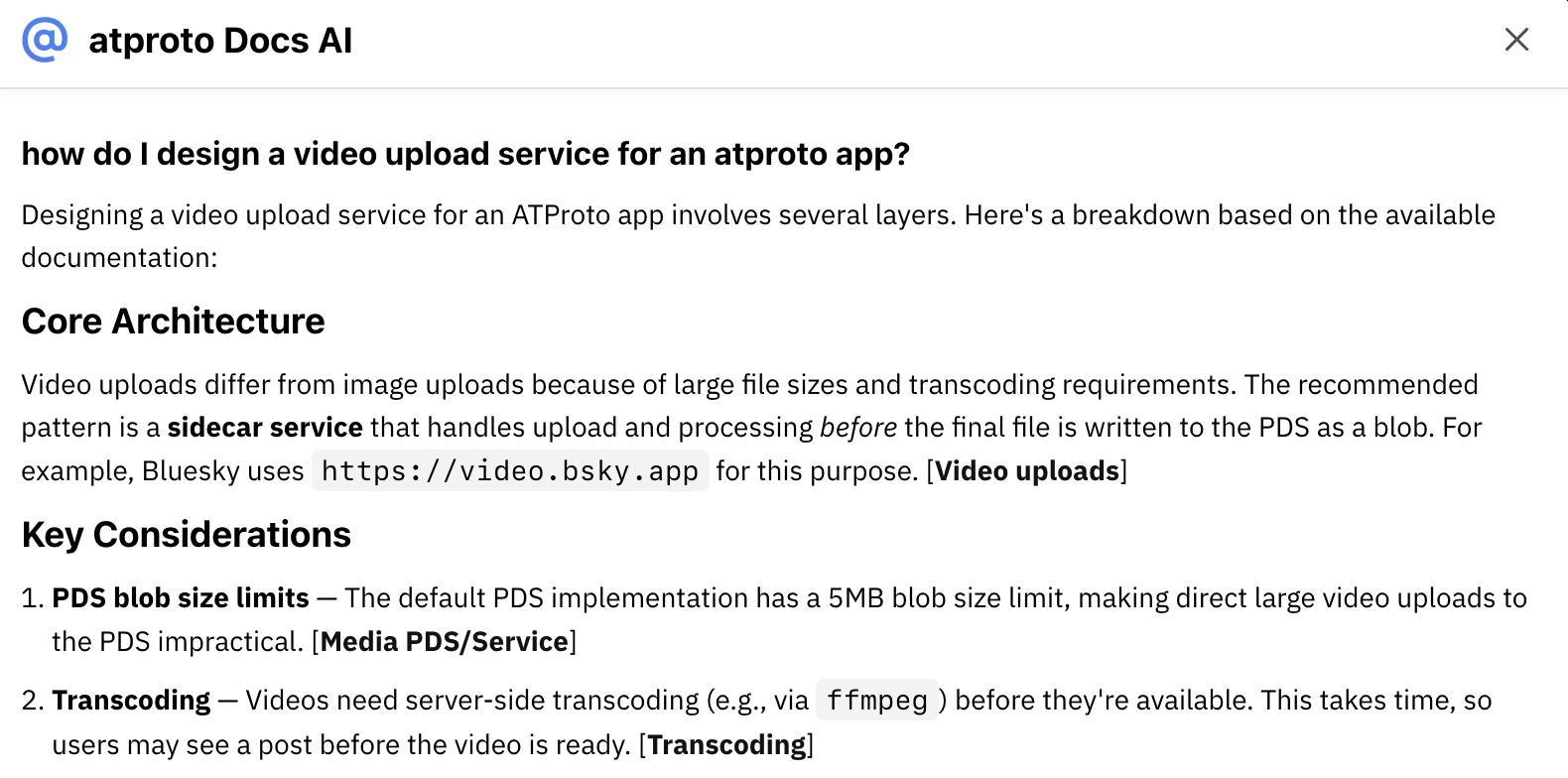 At the moment, it's completely separate from our existing site search, which only indexes atproto.com. Kapa, on the other hand, indexes the community forum, Github discussions, and various READMEs that have other data that's otherwise hard to surface in docs.