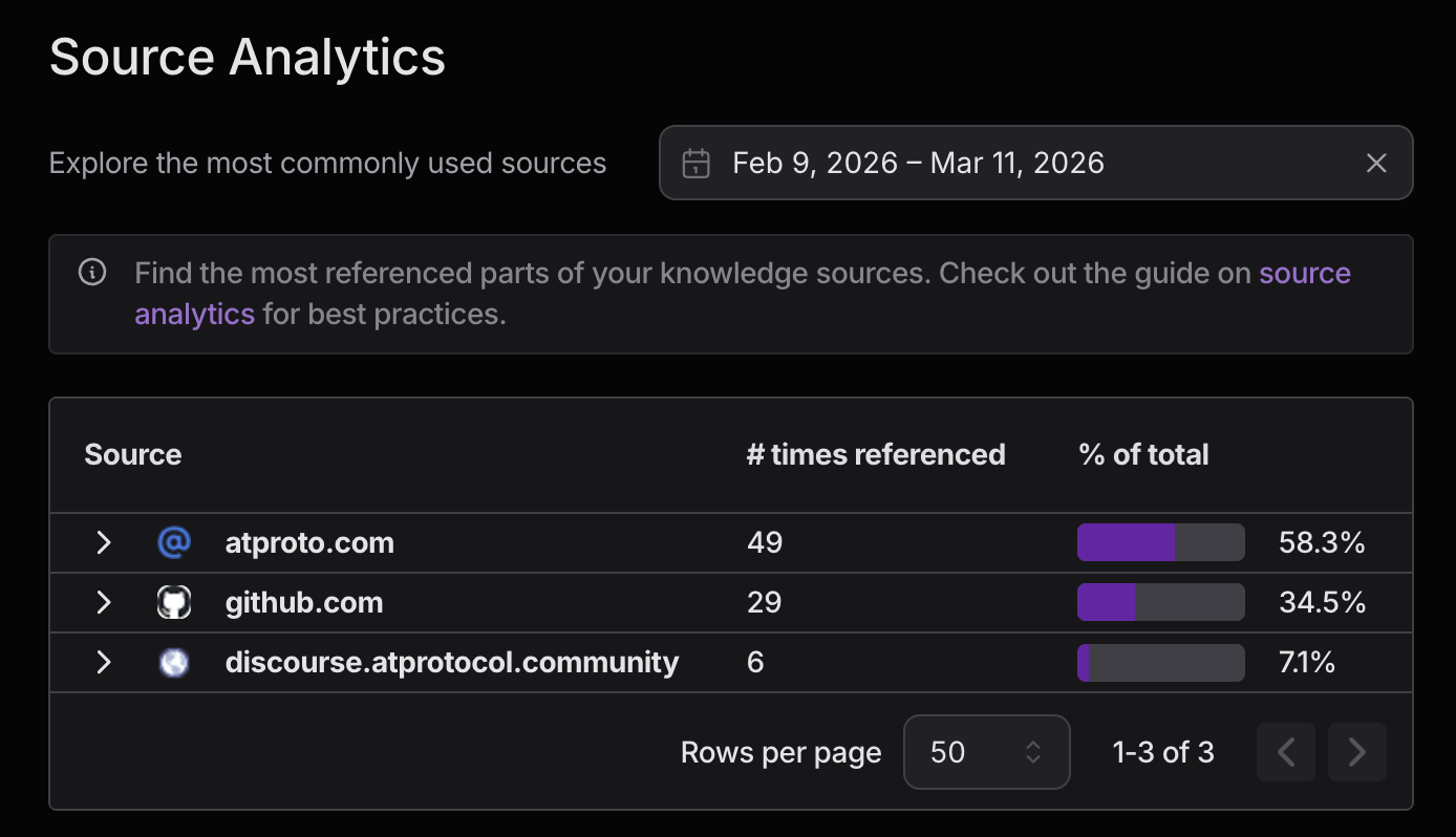 This helps a) drive hallucinations to zero and b) drive traffic (and, even more importantly, context) back to the content that it's indexed. It also gives us some insight into how often it's drawing on each of these sources for different questions: